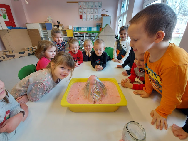 W ostatnim tygodniu przenieśliśmy się do prehistorycznych czasów. Poszerzyliśmy wiedzę o dinozaurach, oglądaliśmy fotografie 3D, ułożyliśmy szkielet tyranozaura. Rozmawialiśmy o życiu pradawnych ludzi, nawet sami zamieniliśmy się w jaskiniowców – zbudowaliśmy jaskinię, którą ozdobiliśmy rysunkami malowanymi węglem, uszyliśmy stroje, a także przygotowaliśmy naszyjniki z kości.